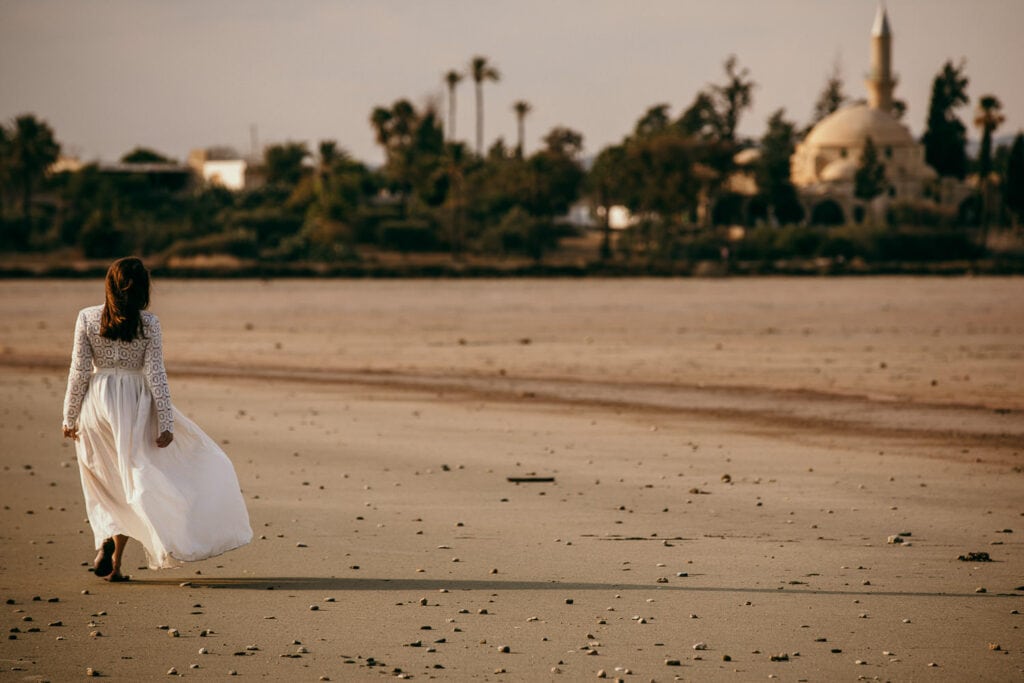 Towards the end of the day, as the setting sun cast a golden glow across Larnaka and the Salt Lake, we knew it was time for our finale shots. Magda, now completely at ease with the camera, exuded a radiant glow, much like the sun-drenched landscape around her. These final moments epitomized the spirit of Cyprus wedding photography for me - capturing raw, heartfelt emotions against a backdrop of natural and cultural grandeur.
